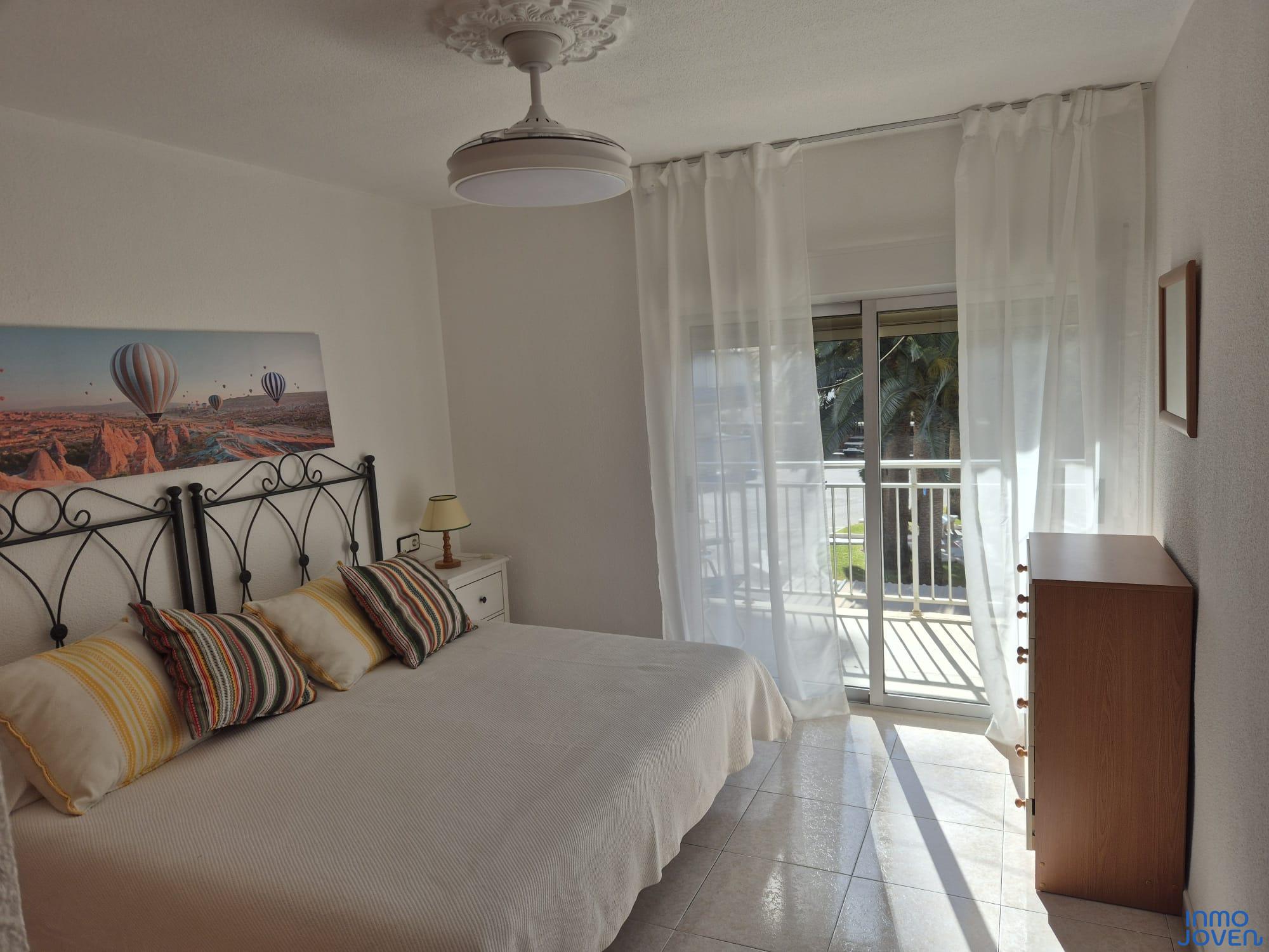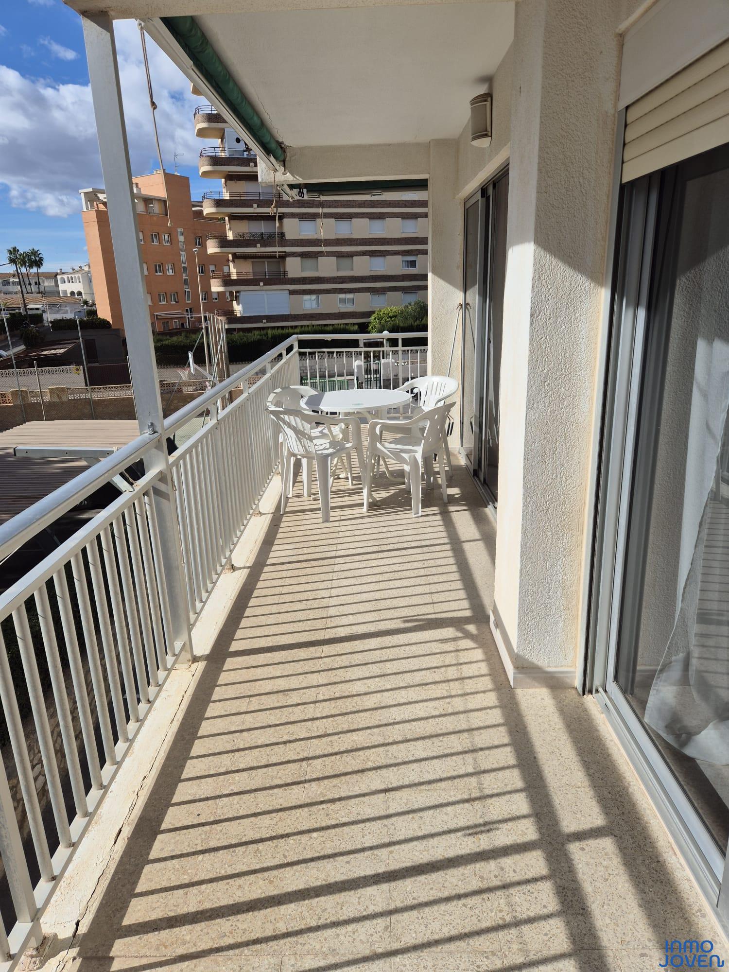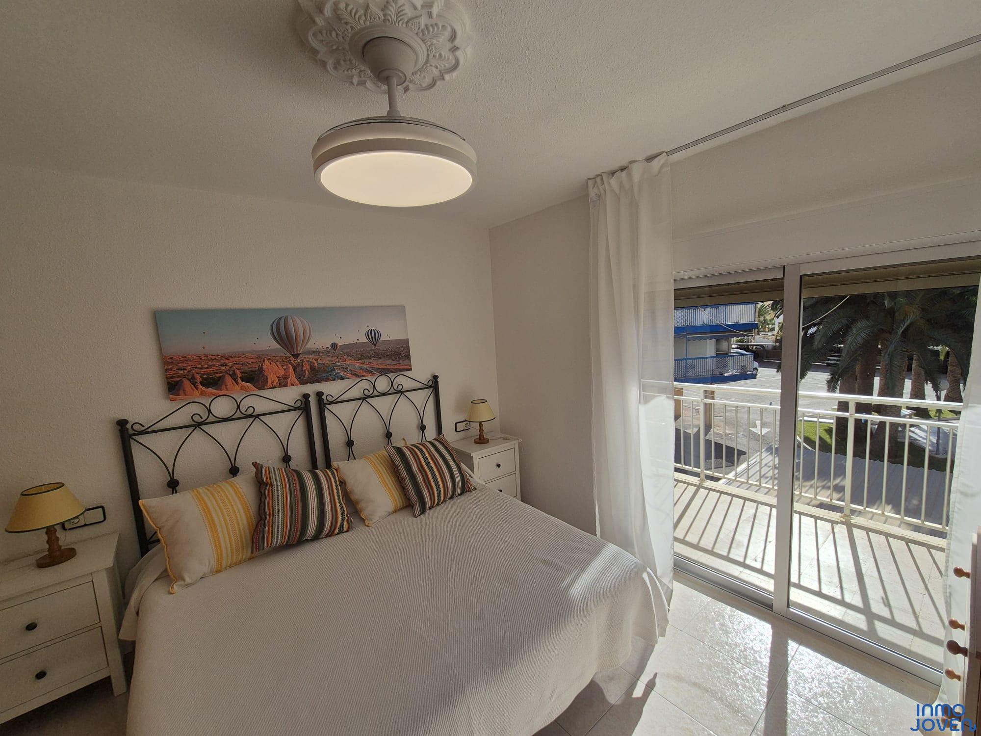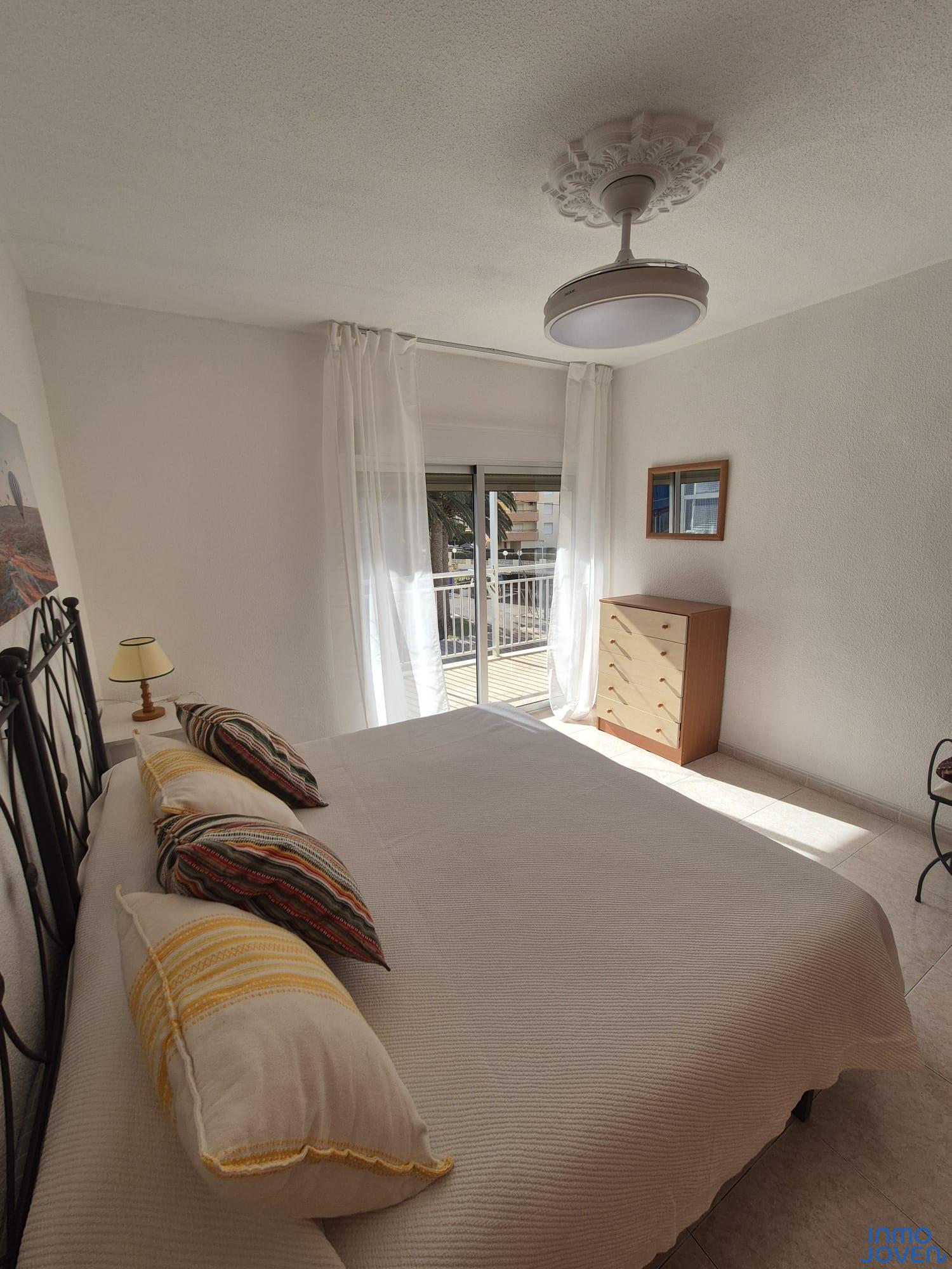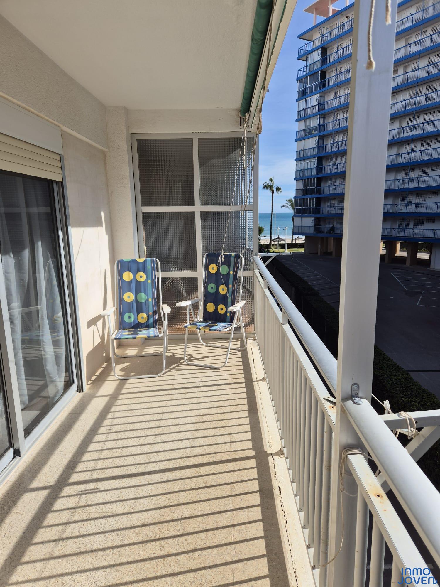 Apartamento en primera línea de playa, Edificio Mediterráneo . 2º Dos dormitorios con armarios empotrados. Dormitorio principal con salida a amplia terraza con vistas al mar y panorámicas . Un cuarto de baño completo. Salón comedor con salida a terraza con vistas al mar. Cocina equipada con electrodomésticos. Residencial muy cuidado con acceso a dos calles, salida directa a la playa, rodeado de comercios y ocio, muy bien comunicado con parada de tranvía y autobús. Parking en superficie.