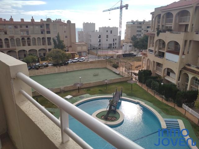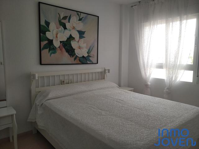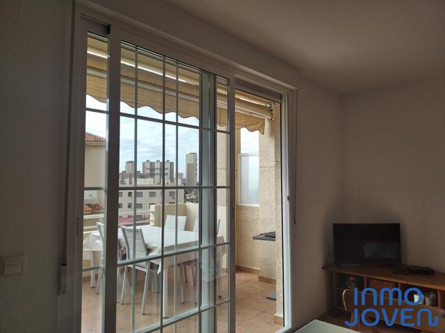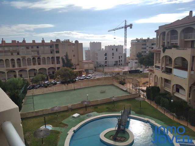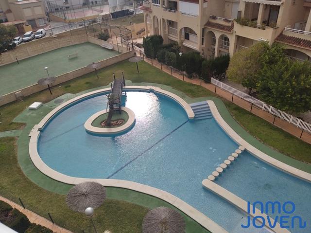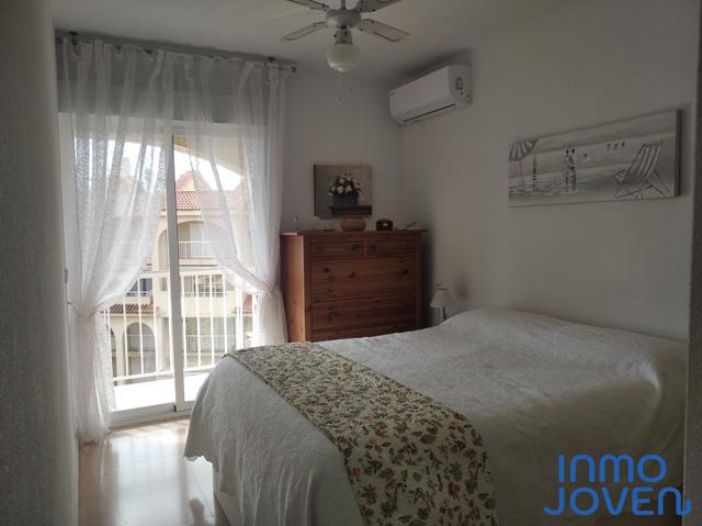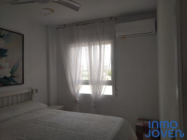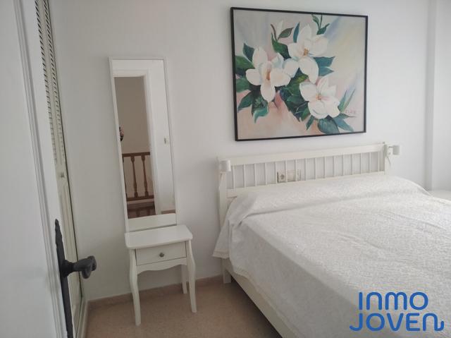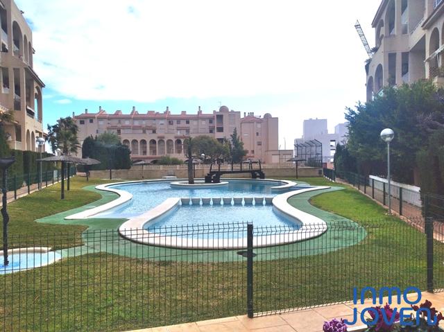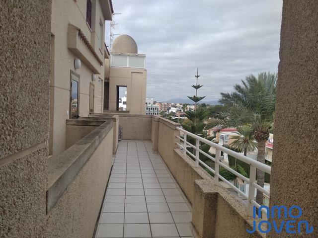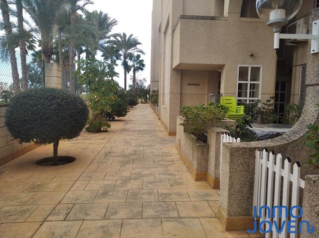 Apartamento dúplex en Playa Muchavista. Planta de abajo salón comedor con salida a terraza con vistas al mar y panorámicas. Cocina equipada con electrodomésticos. Lavadero. Aseo de cortesía. Primera planta tres dormitorios con armarios empotrados y con salida a terraza con vistas panorámicas y a los jardines. Un cuarto de baño completo. Equipado con A/A frio y calor, ventilador en el techo. En perfecto estado. Piscina, jardines. Zona infantil, zona de juegos. Plaza de garaje numerada. Muy bien comunicado con zona comercial y estación del tram.