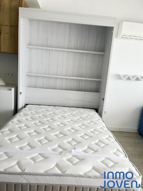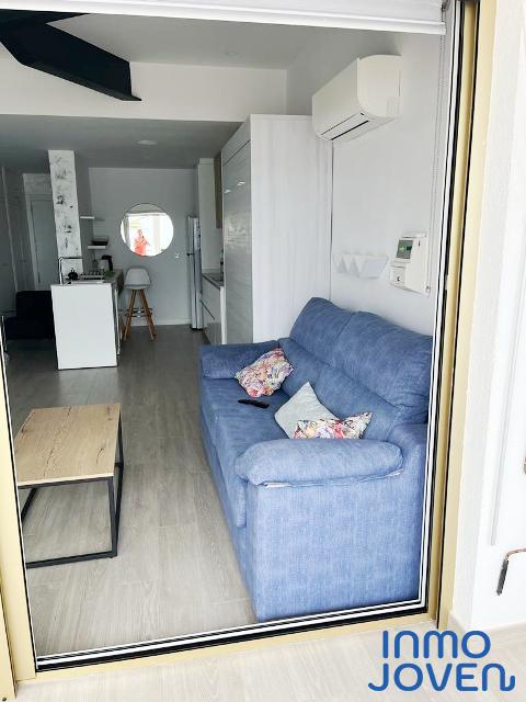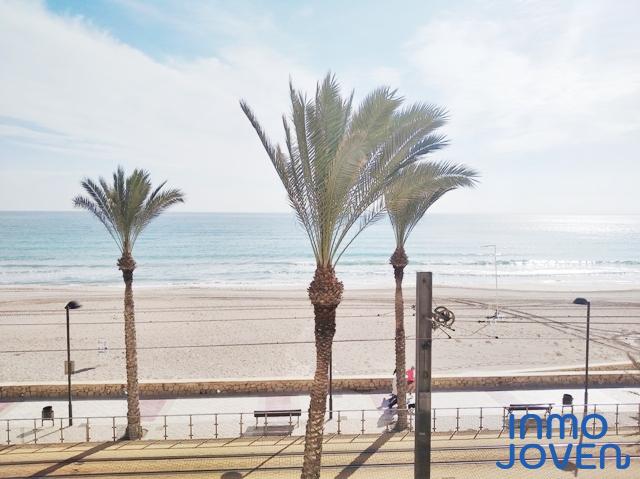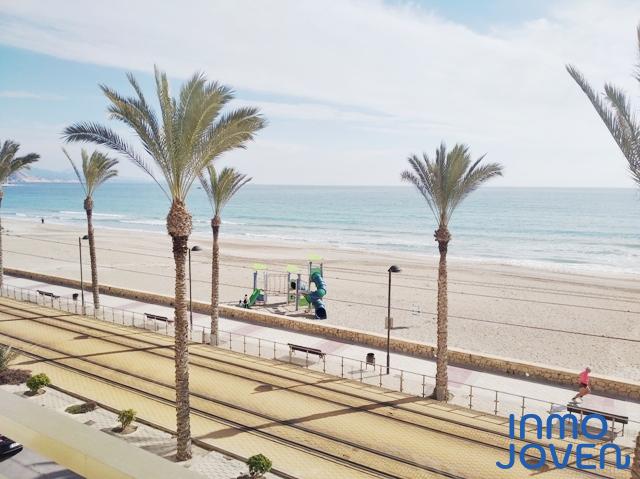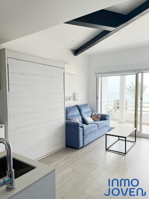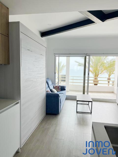 Estudio en primera linea de playa Muchavista. Todo diáfano. Salón comedor con salida a terraza con vistas al mar. Cocina Americana equipada con electrodomésticos. Un baño completo. Equipado con A/A frio y calor funcionando con monedas 1€ 4 horas de servicio . En perfecto estado. Muy luminoso. Reformado. Parking en el interior de urbanización las lanzas. Piscinas, jardines. Zonas infantiles. Pistas de tenis y padel. Zonas deportivas. Restaurante dentro de la urbanización. Chiringuito en la piscina. Muy bien comunicado con zona comercial y estación del tram.