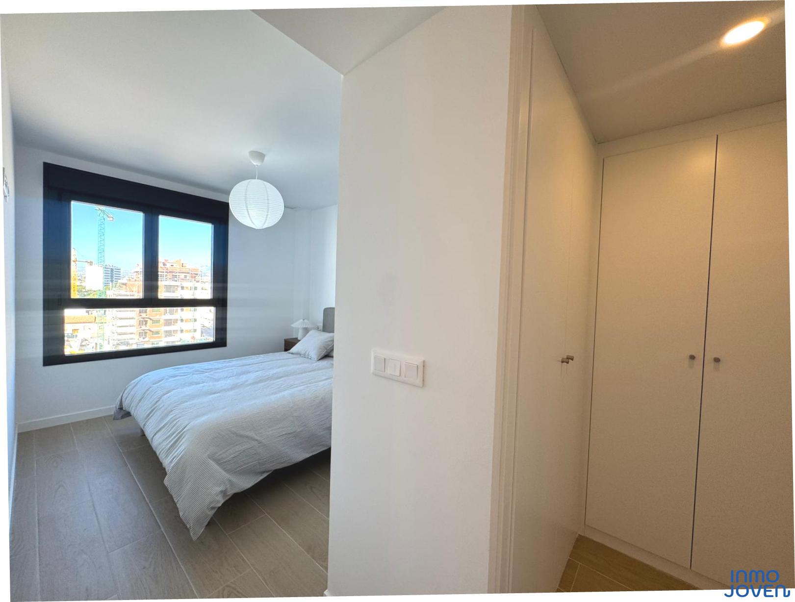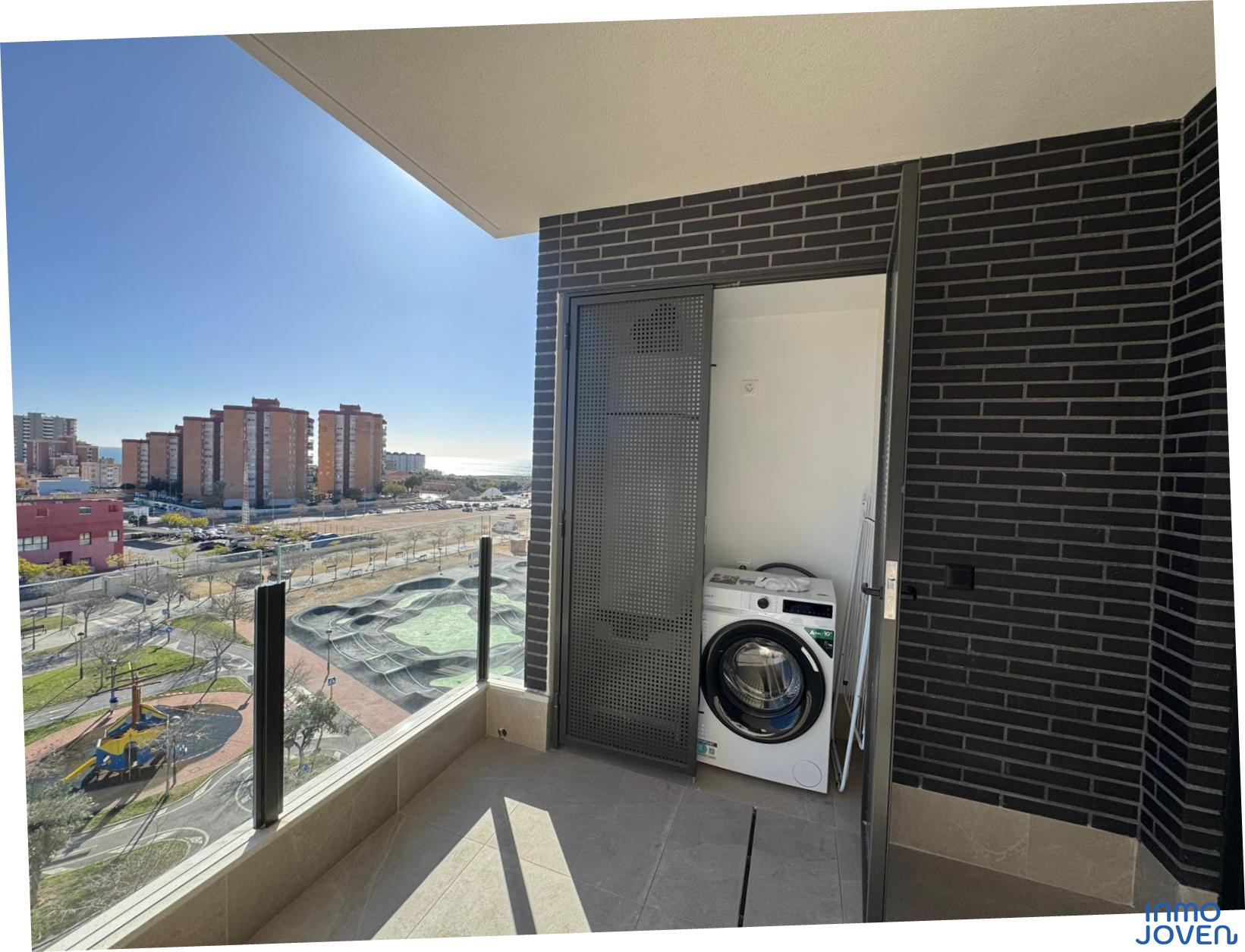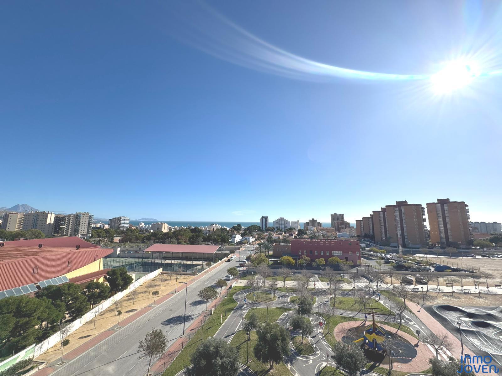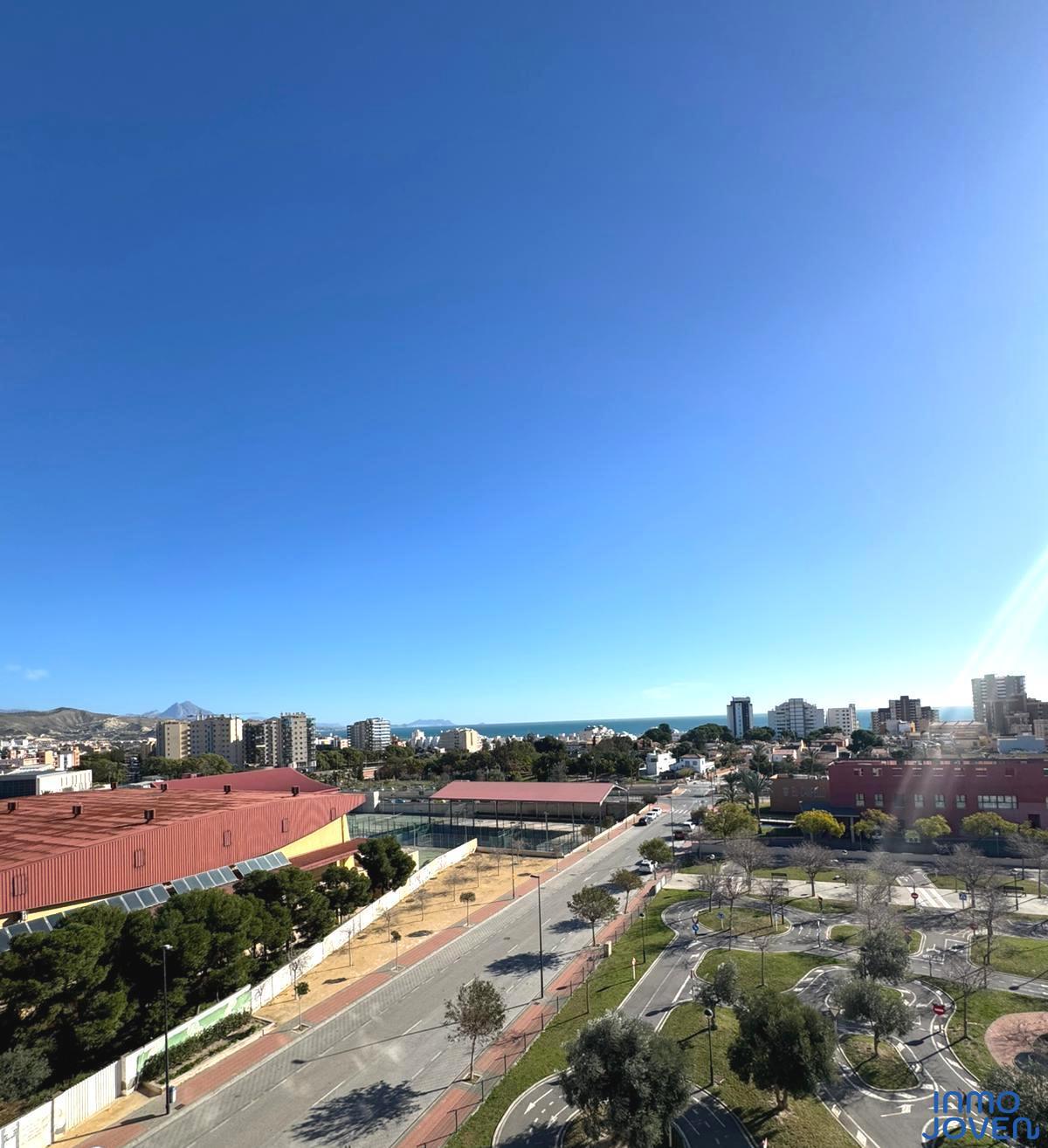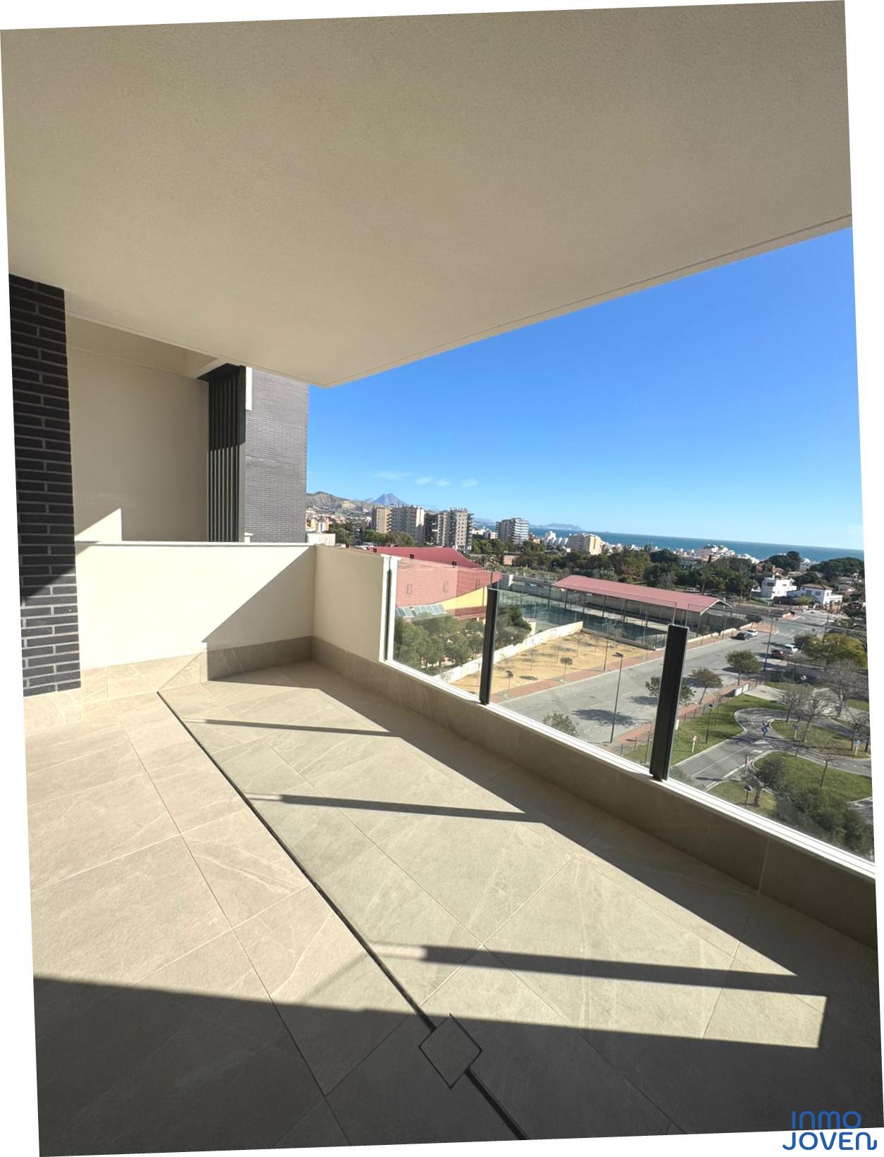 Moderno apartamento a estrenar en El Campello piso 6º. Residencial Aquamarine . Vivienda en edificio de nueva construcción. Salón comedor con salida amplia terraza con vidrio de seguridad para que las impresionantes vistas al mar y panorámicas s aprecien desde toda la estancia no solo desde la terraza.. Cocina semi – americana con acceso a terraza . Dos dormitorios con armarios empotrados, Dormitorio principal con cuarto de baño completo en suitte. Dos cuartos de baño completos. Aire acondicionado frio- calor por conductos , Aerotermia, Puerta blindada. Plaza de garaje subterránea , Residencial con piscina zona de juegos infantiles . Rodeado de servicios, comercios y fácil acceso todas direcciones y transporte.