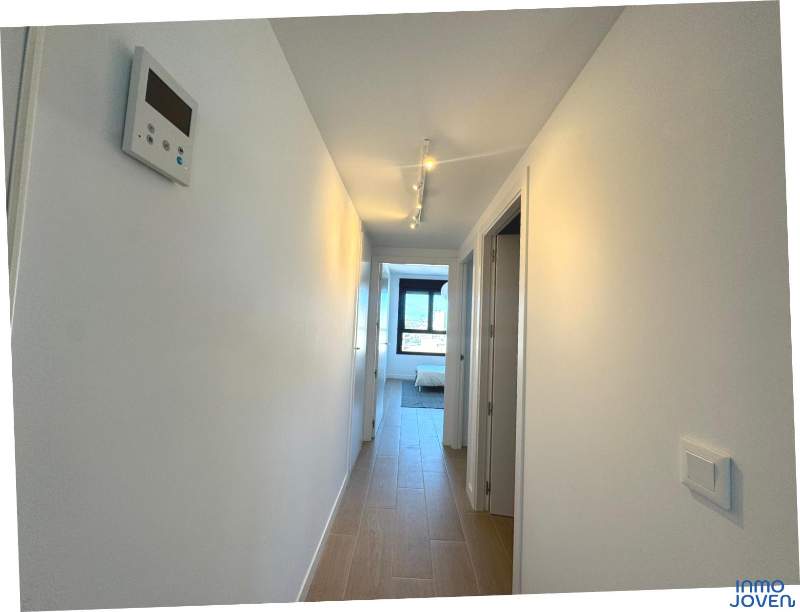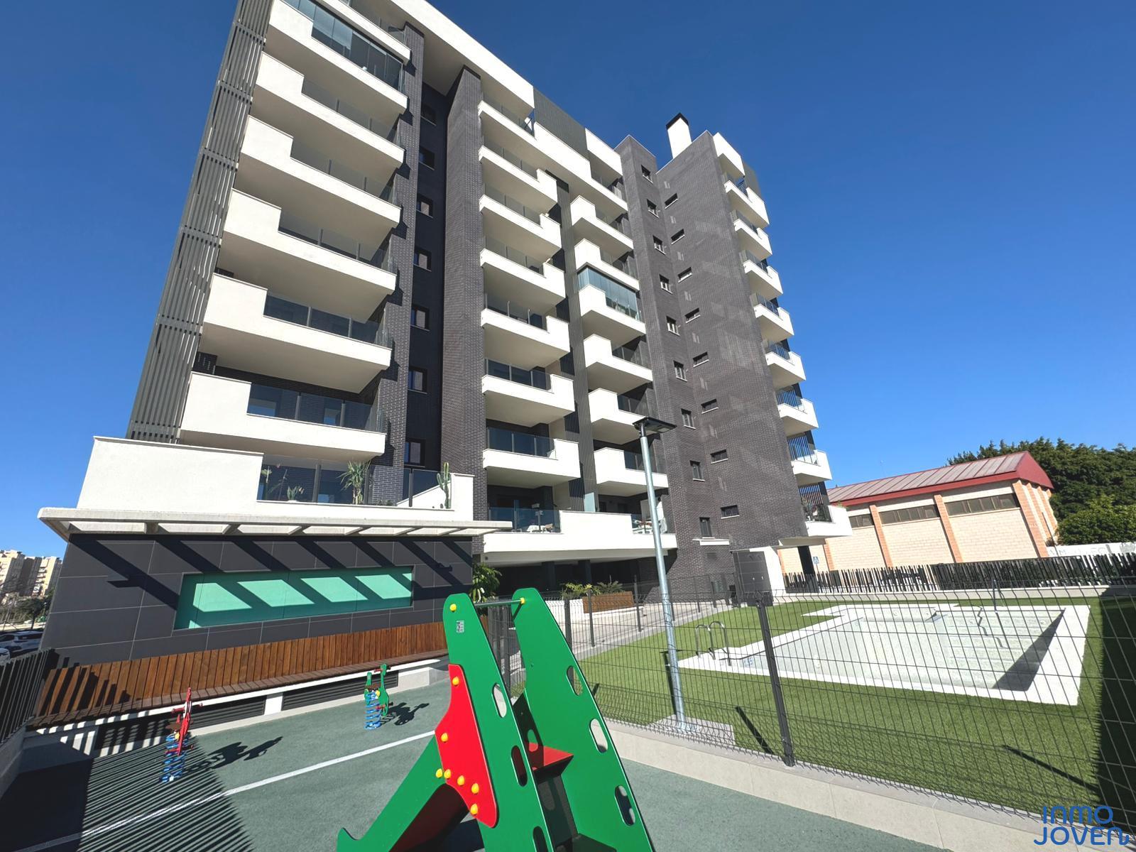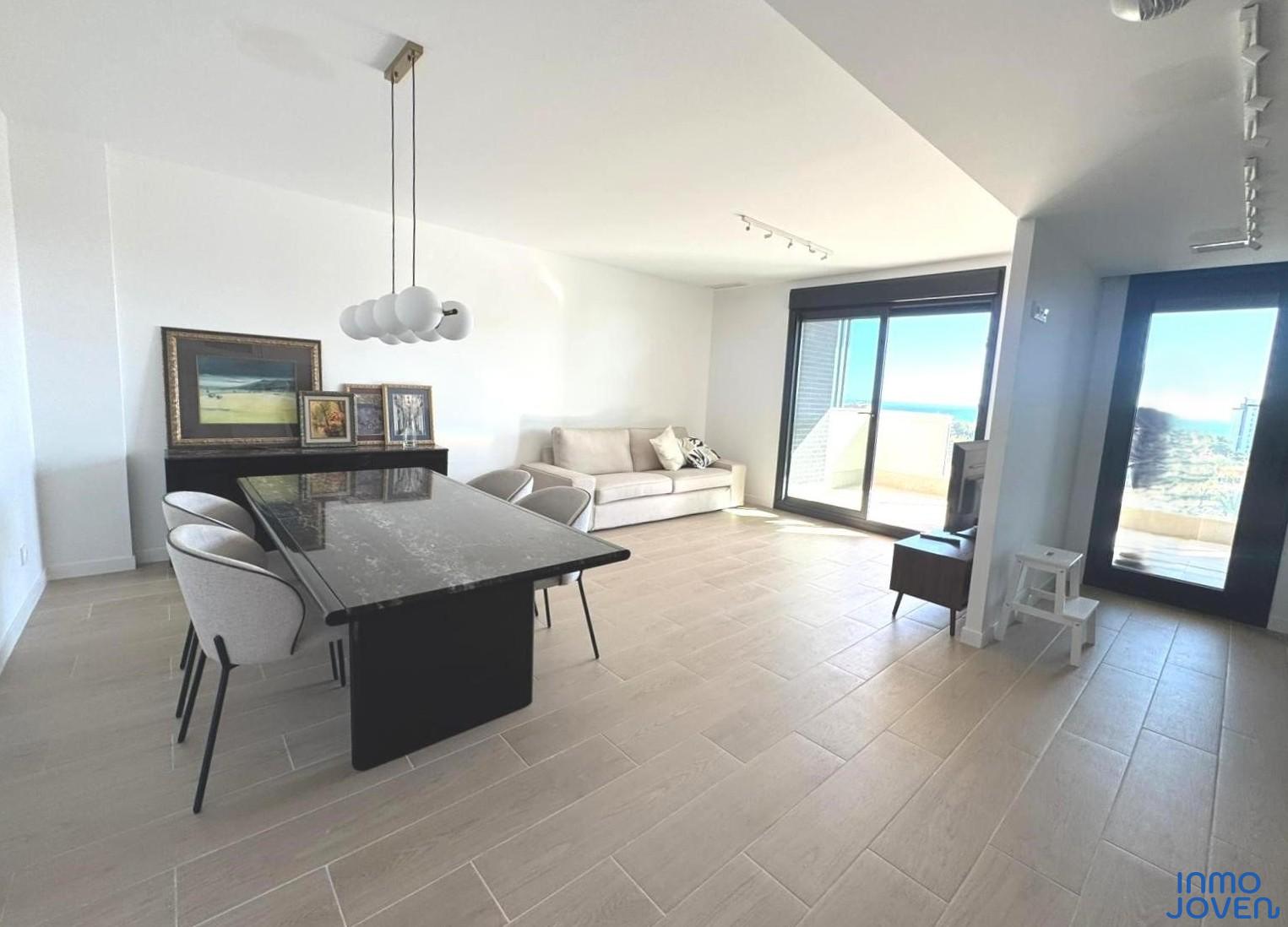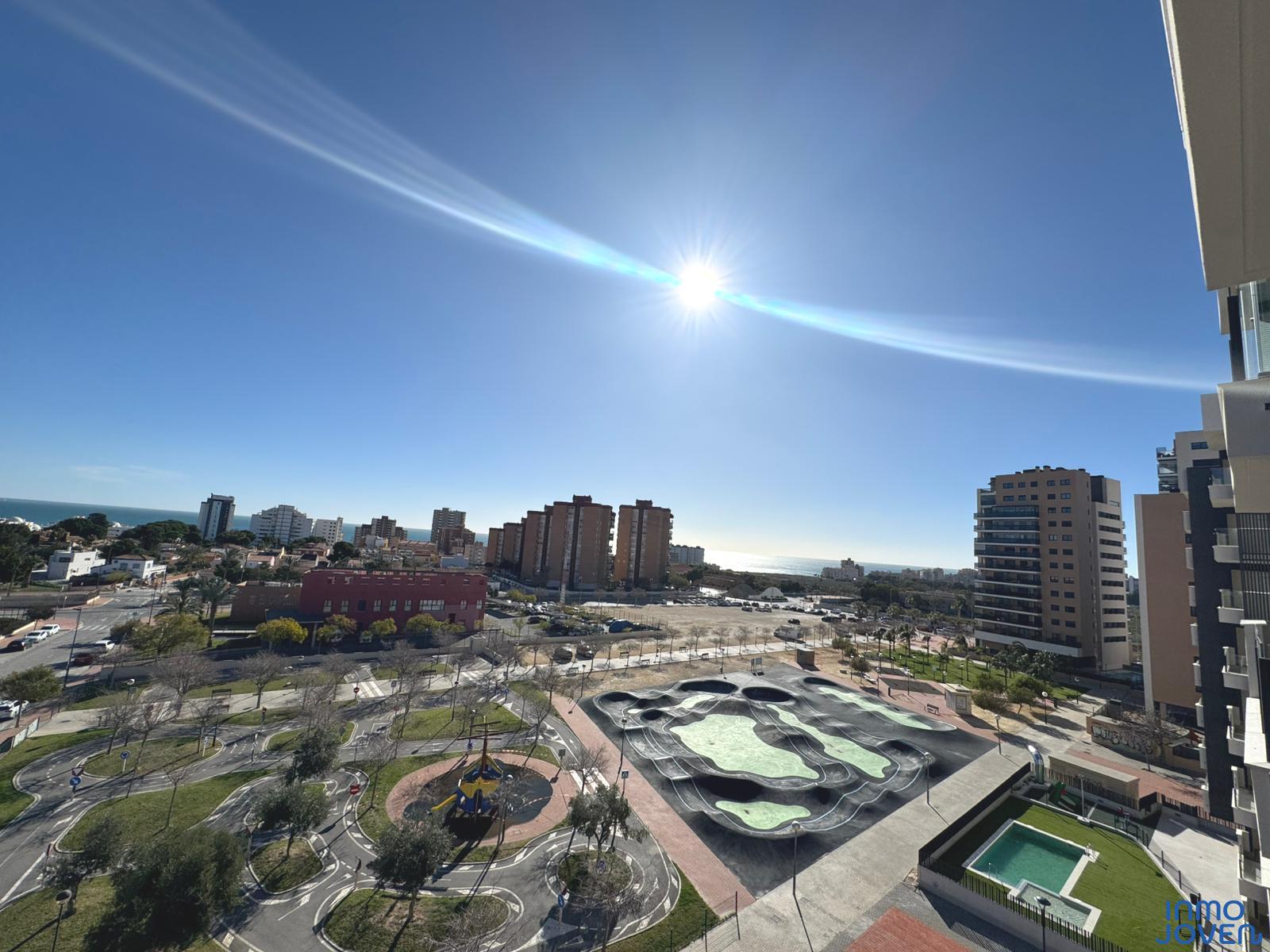Moderno apartamento a estrenar en El Campello piso 6º. Residencial Aquamarine . Vivienda en edificio de nueva construcción. Salón comedor con salida amplia terraza con vidrio de seguridad para que las impresionantes vistas al mar y panorámicas s aprecien desde toda la estancia no solo desde la terraza.. Cocina semi – americana con acceso a terraza . Dos dormitorios con armarios empotrados, Dormitorio principal con cuarto de baño completo en suitte. Dos cuartos de baño completos. Aire acondicionado frio- calor por conductos , Aerotermia, Puerta blindada. Plaza de garaje subterránea , Residencial con piscina zona de juegos infantiles . Rodeado de servicios, comercios y fácil acceso todas direcciones y transporte.